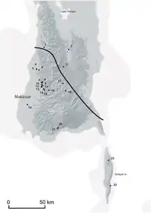The earliest peopling of Sulawesi is considered to be related to a wave of migration through Indonesia around 45 thousand years ago, during which some people stayed in the area while others continued to eventually reach Sahul.[10] A number of related Pleistocene sites in the area are known for their rockart.[11][12] These sites predate the Toalean culture, and an absence of archaeological sites dated to the intervening period between 12-8kya prevent a direct link.