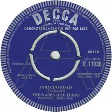 The English group The Nashville Teens' garage rock[1][2]/blues rock[3] rendering was a bold effort featuring prominent piano, electric guitar, and bass drum parts and a dual lead vocal. Mickie Most produced it with the same tough-edged-pop feel that he brought to The Animals' hits. "Tobacco Road" was a trans-Atlantic pop hit in 1964, reaching number 6 on the UK singles chart and number 14 on the U.S. singles chart. While the Teens would have some further success in the UK, in the U.S. "Tobacco Road" became another one-hit wonder of the British Invasion.