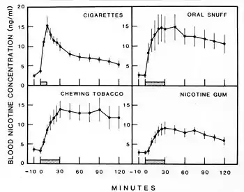 Smoking is the most common method of consuming tobacco, and tobacco is the most common substance smoked. The agricultural product is often mixed with additives[4] and then combusted. The resulting smoke is then inhaled and the active substances absorbed through the alveoli in the lungs or the oral mucosa.[5] Many substances in cigarette smoke trigger chemical reactions in nerve endings, which heighten heart rate, alertness[6] and reaction time, among other things.[7] Dopamine and endorphins are released, which are often associated with pleasure.[8]