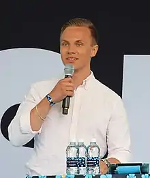 Andersson graduated with a bachelor's degree in economics at the Gothenburg School of Business, Economics and Law in 2018.[2] In 2014, at the age of 18, Andersson was elected to the Skövde municipal council for the Sweden Democrats, and then became group leader for the party in the municipality. At the time he was a member of the Sweden Democratic Youth (SDU).[3] In 2015, he ran for chairman of the SDU against Jessica Ohlson and was seen as a more moderate candidate but narrowly lost the election. After the Sweden Democrats announced it was to break ties with the SDU due to repeated controversies, Andersson became the national spokesperson of the new Young Swedes SDU on 1 October 2015, and was the first person to hold the position.[4]