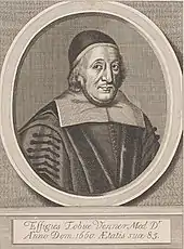 Venner completed his Bachelor of Arts and his Master of Arts degrees respectively in 1595 and 1603 at Oxford's Alban's Hall and went to establish his practice in Bridgwater. He then received in 1613 a Bachelor of Medicine and Doctor of Medicine degree at Oxford with a dispensation for non-attendance at lectures.[1] This kind of exemption was granted for various reasons, sometimes unclear, at Oxford at the turn of the 17th century.[2] After marrying Agnes Jeffrye (died 1634), with whom he had four children, he settled in Bath and by 1630 he enjoyed a rather comfortable life there: the sales of his books and his medical practice flourished, and his three sons went to study medicine at Oxford University although one died before graduating.