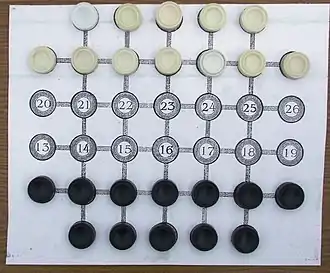 Each player has 12 men or checkers or "hullar" ("hullar" is the plural form of "hul", and hul means servant) distinguishable from the other player (whereas each player has 16 men in Turkish draughts and Armenian draughts), and they are usually distinguished as white and black hul pieces. Each player's 12 hul pieces are initially placed in their respective first two ranks leaving only the two central rows vacant at the beginning of the game. The white hul pieces are placed on points 1 to 12, and the black hul pieces are placed on points 27 to 38. White moves first to begin the game. As in Turkish draughts, a hul may only move one step orthogonally forward or sideways (left or right) in a single turn. A hul promotes to a "tobit" (the equivalent of a king in draughts). When reaching the other player's first rank; specifically the endpoint of a vertical chol (vertical line segment) on the other player's side of the board. Since there are five vertical chols, then there are five endpoints in total where a hul can promote to become a tobit. The tobit may move any number of unoccupied steps forward, backward, or sideways (all four orthogonal directions) in a single turn.