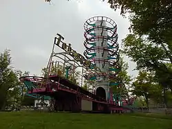 A Toboggan is a portable roller coaster that was manufactured by Chance Industries from 1969 to the mid-1970s. The coaster features a small vehicle, holding two people, that climbs vertically inside a hollow steel tower then spirals back down around the same tower. There is a small section of track at the base of the tower with a few small dips and two turns to bring the ride vehicle back to the station. Each vehicle has a single rubber tire with a hydraulic clutch braking system that governs the speed of the vehicle as it descends the tower. The rubber tire engages a center rail that begins halfway through the first spiral. The ride stands 45 feet tall with a track length of 450 feet. A typical ride lasts approximately 70 seconds.[1][2][3]