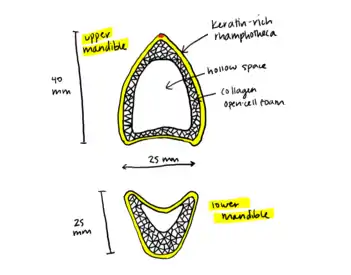 The inner beak is a collagen foam, with a high glycine content and subsequent hardness as in most bones.[2] The fibrous network of collagen trabeculae varies from 70 to 200 micrometers in thickness and are often hollow with an edge connectivity of 3 or above.[3] These, along with even thinner (2 to 25 micrometer) membranes characterize a closed cell foam network which provides the optimal strength at low density for flight consideration.[3] The membranes and trabeculae have higher calcium mineralization content than the dense outer beak.[3] Micro- and nano- indentation testing supports the notion that the inner collagen trabeculae are stronger pound for pound than the outer shell.[1]