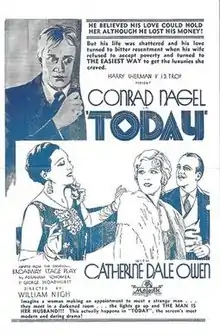 Today is a 1930 American pre-Code drama film directed by William Nigh and starring Conrad Nagel, Catherine Dale Owen and Sarah Padden.[1] It was co written by Seton I. Miller and was based on a play by George Howells Broadhurst, which had previously been made into a silent film of the same title. The film's sets were designed by the art director Albert S. D'Agostino.