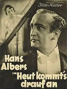Today Is the Day (German: Heut' kommt's drauf an) is a 1933 German comedy film directed by Kurt Gerron and starring Hans Albers, Luise Rainer and Oskar Karlweis.[1] It features a number of jazz interludes. The film's sets were designed by the art directors Max Knaake and Julius von Borsody.