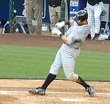 Helton's power and RBI production stayed relatively level to his previous year's stats during the 2007 season, as he managed 17 home runs and 91 RBI. Despite these numbers being below his career averages, Helton kept up his string of seven consecutive seasons with an on-base percentage higher than .400, nine consecutive seasons with a batting average above .300, and had also been walked more times than he had struck out (a feat he had accomplished in seven of his first ten full seasons).[19] Helton recorded his 1,000th career hit at Coors Field on June 20, 2007, in a 6–1 home win over the New York Yankees, becoming only the fifth active player to have 1,000 career hits in one ballpark.[36] On September 9, in 4–2 home victory over the San Diego Padres, Helton hit his 35th double of the season. This made him the only player in MLB history to have hit 35 or more doubles in at least 10 consecutive seasons (1998–2007).[37][38] Helton hit his 300th career home run on September 16, in a 13–0 home win over the Florida Marlins.[39][40] He became the first player to hit 300 home runs for the Rockies.[41]