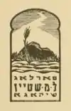 He was the most prominent of the 14 graphic artists who participated in A Gift to Biro-Bidjan in 1937, an album of 14 woodcuts produced as a fund-raising project for the Chicago ICOR (whose acronym comes from the Yiddish name for the Association for Jewish Colonization in the Soviet Union[24]) to support the Jewish Autonomous Oblast.[25][26] Geller's contribution to the portfolio was a woodcut based on Raisins and Almonds, the Yiddish lullaby written by Abraham Goldfaden in 1880 for his operetta Shulamis.[8] The woodcut shows several scenes as a boy grows up and travels from Eastern Europe to Chicago: the boy's mother and a goat surrounding his cradle, the boy studying, the grown man walking with a sack on his back passing an open market, the man working as a tailor to earn money to immigrate to the New World, and a scene of an elevated train and the smokestacks of Chicago with unemployed workers demonstrating with banners and flags.[8] The last scene, on the theme of new hope, shows the man standing looking up and grasping a newly planted tree.[8] The other artists who contributed woodcuts were Alex Topchevsky, William Jacobs, Aaron Bohrod, David Bekker, Louis Weiner, Mitchell Siporin, Edward Millman, Fritzi Brod, Bernece Berkman, Morris Topchevsky, Abraham Weiner, Raymond Katz, and Ceil Rosenberg.[8]