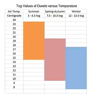 British duvets are sold in steps of 1.5 tog from 3.0 tog (summer) to 16.5 tog (extra-warm). The stated values are a minimum; actual values may be up to 3 tog higher. Also, these values assume there is no added duvet cover that can trap air.