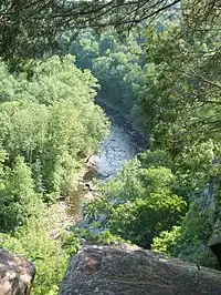 The ground along this part is very rocky and the creek quickly loses elevation, creating a clear, fast current. It is also along this part of its course that the creek dramatically cuts a valley into the steep hills along its sides. At the area popularly known as High Rocks, vertical walls of stone up to 200 ft (61 m) high rise above the northern edge of the creek. However, as the creek enters Point Pleasant, the ground evens out a bit and the creek becomes relatively more tranquil before entering the river.