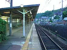 The station consists of one side platform serving single bi-directional track. The effective length of the platform is for four-carriage trains. There are stairs and an elevator from the ticket gate to the platform, and there are no ramps, but the stairs are equipped with two-step handrails. The platform has a waiting room. The station is unattended.
