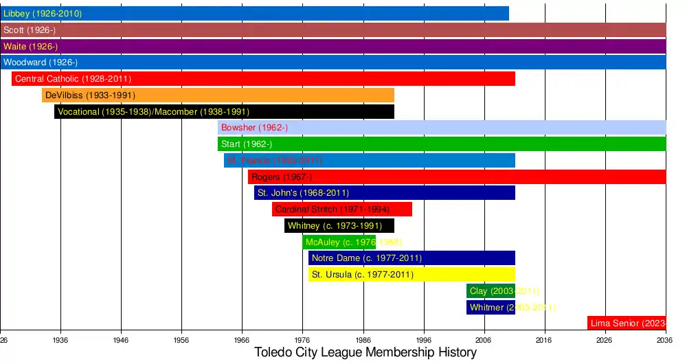 - Girls basketball returned to competition for the first time in 33 years and was made a league sport in the 1969–70 school year, with teams from Bowsher, Central Catholic, DeVilbiss, Libbey, Rogers, Scott, Start, Waite, and Woodward competing against each other for the first time.[28] Prior to this setup, girls at the public schools only competed in intramural-type fashion. It was expected to add McAuley, Notre Dame, St. Ursula, Spencer-Sharples, and Whitney to the mix the following year.
