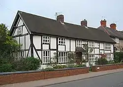 The Tollemache Almshouses stand immediately adjacent to the Wilbraham's Almshouses, and were built on their gardens, at what was then the end of Welsh Row. Like the earlier almshouses, they accommodated six men; four were from Nantwich and two from the neighbouring village of Acton.[8][12] In the 1880s, the inhabitants were old married men; their widows were allowed to remain provided that they "conduct themselves properly."[8] Historian James Hall describes the almshouses at that time as "comfortable dwellings of two stories, with their gardens in front" which were "an ornament to the west end of the town".[8] In 1892, the total annual endowment of the original charity was £12. The almsmen each received 10 shillings quarterly, a pair of shoes annually and £1 4s 6d every two years for other clothing from the Tollemache family. Additionally, increases in the original endowment by bequests from Peter Sprout and from Elizabeth and Mary Bennion, respectively, resulted in an extra £2 per head plus a share of £21 10s annually.[8][12] According to a scheme dated 23 June 1870, the single trustee of the Wilbraham Almshouse Charity was John Tollemache, who selected the almsmen; the Tollemache family continued to maintain the almshouses until 1978.[9][12]