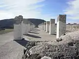Most of Tula was set up in a grid plan. The buildings were made of stone with an adobe finish. The Atlantes of Tula are representations of the god Tlahuizcalpantecuhtli in warrior attire which were used as columns to hold up the roof of the great room in the god's temple.[36]