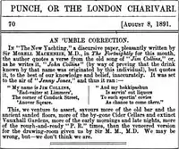 Clearly unaware of the drink's actual origins, in August 1891, British physician Sir Morell Mackenzie wrote an article in the influential 19th century magazine Fortnightly Review claiming that England was the originating country for the Tom Collins cocktail and a person named John Collins was its creator.[2] In the article, Mackenzie quoted an old song called "John Collins."[2] However, the British weekly magazine Punch immediately disparaged Mackenzie's efforts, noting in August 1891 that the title of the song actually was "Jim Collins" and that Mackenzie otherwise inaccurately quoted and characterized the song.[2]