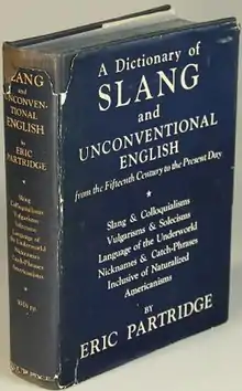 A Dictionary of Slang and Unconventional English is a dictionary of slang originally compiled by the noted lexicographer of the English language, Eric Partridge. The first edition was published in 1937 and seven editions were eventually published by Partridge. An eighth edition was published in 1984,[1] after Partridge's death, by editor Paul Beale; in 1990 Beale published an abridged version, Partridge's Concise Dictionary of Slang and Unconventional English.[2]