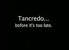 On November 13, the campaign released a controversial advertisement called "Tough on Terror" in which a hypothetical terrorist attack occurs in a shopping mall. The ad blames inept border security for the attack and flashes images of an injured child and a wrecked train. After Tancredo gives his approval for the message with the comment "I approve this message because someone needs to say it," a voiceover states, "There are consequences to open borders beyond the 20 million aliens who have come to take our jobs... the price we pay for spineless politicians who refuse to defend our borders against those who come to kill."[13] Since its release, the ad received criticism from some who called it "cheap" and "blatant fearmongering." Bowdoin College political scientist Michael Franz likened the advertisement to the Daisy ad run by Lyndon B. Johnson in the 1964 Presidential election claiming that the election of Barry Goldwater would lead to a nuclear war. The other Republican candidates in the race did not comment on the ad.[14]