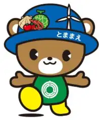 Tomamae's mascot is Kumada Tomao (くまだ とまお), better known as Tomao-kun (とまおくん). He is a 7-year-old brown bear cub. He wears a hat that has two badges (a windmill badge and a badge dedciated to agricultural and seafood products).[1]