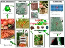 Tomato brown rugose fruit virus can be transmitted mechanically - the virus is stable outside of the plant and so can spread between plants on contaminated tools, clothes or hands.[29] Seed transmission is suspected but has not yet been verified,[30] though it has been detected on tomato seed moving in trade.[24] The virus can also spread via plant propagation.[29] It has been inferred that mechanical transmission from the seed coat to the growing plant may occur.[6]