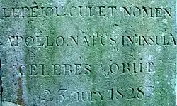 The grave consists of two stones. On the first stone is a Latin text, which translated reads: "Lepejou, also called Apolloon, was born on the island of Celebes and died on July 23, 1828." On the second stone is an Arabic text, which translated reads: "The lord has his most loyal servant dedicated this tomb, because he is grateful to him and always thinks of him."[8]