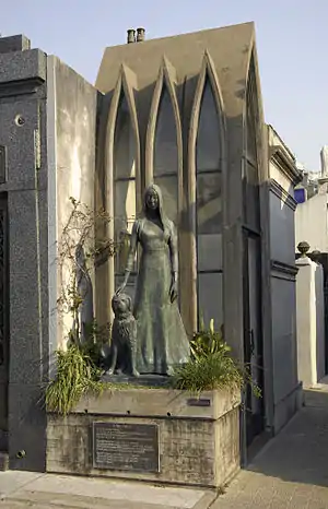 26-year-old Liliana Crociati de Szaszak (1944–1970) was in Innsbruck, Austria on 26 February 1970, when her hotel was struck by an avalanche, killing her.[1][2] Her tomb was designed by her mother in the Neo-Gothic style, in sharp contrast to the other tombs in the cemetery.[3] Adjacent to the tomb stands a dais adorned with a plaque containing an Italian-language poem by her father, and topped by a life-size green bronze statue of Crociati de Szaszak in her wedding dress,[4] by sculptor Wíeredovol Viladrich.[5][6][2] Following the death of Crociati's dog Sabú, a bronze statue of the dog, also by Viladrich,[6] was added, with Crociati's hand resting on the dog's head.[1][2][7]