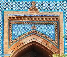 The exterior is further embellished with regional-style tile-work in floral, arabesque, and geometric motifs with dark blue, azure, and white tiles - all of which contrast the deep red finely polished bricks. The white dome is decorated with blue tile-work along its lower perimeter.[3]
