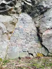 Aside from these three main buildings, many other minor structures created by Malmgren are dotted around the surrounding landscape. One of these is a vaulted cavern cut into the grey rock of Fjällsätern at some point between the 1890s and the 1920s. Following his death on 3 August 1922, the local authorities decided against burying him in his intended final resting place, and instead he was buried at the nearby Eastern Cemetery. There, where he was joined by his wife Hilma Malmgren following her death in 1942, a large tombstone bearing his portrait was raised.[2] The old tomb is now bricked up.[1]