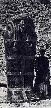 A total of nineteen ushabti were present in the tomb – fifteen inscribed for Yuya and four for Thuya. Most of the ushabti were still in their boxes, placed between Yuya's sarcophagus and the wall; a further four were recovered from a box by the doorway. The majority of the figures are made of wood, several of cedar and one of ebony, often with gilded faces and wigs or collars.[16] Thuya's ushabti are more expensive than her husband's, as two are covered with silver leaf with gold details and two are gilded.[17] Yuya has an unusual example made of copper sheet over a wooden core. The figures are inscribed with Spell 6 of the Book of the Dead, instructing them to do the work of the deceased in the realm of the dead; Yuya's alabaster ushabti is uninscribed. Seven of Yuya's ushabti were stolen from the Egyptian Museum during the 2011 Egyptian revolution; six have since been recovered.[16]