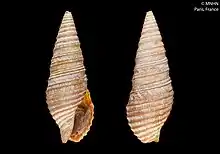 The size of the shell varies between 8 mm and 17 mm. The small shell is lanceolate and lurid. It contains ten shouldered and carinate whorls, with elevated revolving lines of which there are ten or twelve on the body whorl. The narrow aperture measures one-third the total length of the shell. The outer lip has a profound, wide sinus. The columella is smooth.[2]