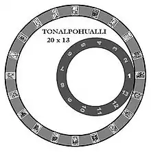The tōnalpōhualli (Nahuatl pronunciation: [toːnaɬpoːˈwalːi]), meaning "count of days" in Nahuatl, is a Mexica version of the 260-day calendar in use in pre-Columbian Mesoamerica. This calendar is solar and consists of 20 13-day (trecena) periods. Each trecena is ruled by a different deity. Graphic representations for the twenty day names have existed among certain ethnic, linguistic, or archaeologically identified peoples.[1]