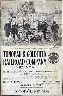 Predecessors of the Tonopah and Goldfield (T&G) Railroad, including the Tonopah Railroad, began operations in 1903.[2] The decade of the 1900s was a period of frenzied railroad-building in southwestern Nevada, with rich silver ore discovered at Tonopah in 1900[3] and gold-bearing quartz at Goldfield in 1902.[1] In addition, silver was struck at Silver Peak. As the entire region was then served by nothing but stagecoaches, an infrastructure was quickly begun to serve what was a fast-growing network of precious-metal mines and miners.[1] The first predecessor of the Tonopah and Goldfield Railroad, the Tonopah Railroad (built 1903-1904), was a 60-mile-long (97 km) narrow gauge line from what was then called Sodaville Junction (9 miles or 14 kilometres south of Mina) to Tonopah.[1] This spur line merged with the Goldfield Railroad in November 1905 to create the Tonopah and Goldfield Railroad, and the merged rail line would continue to do business under this corporate name until ceasing operations in 1947.[1][2]