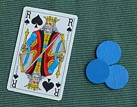 At the start of the game, each player receives a quantity of jetons, the amount being determined by how long they want to play. This is called the mise. The higher the mise, the longer the game will last. A typical amount might be 12 jetons per player. A small table basket (corbillon) is placed in the middle of the table to which each player antes 3 jetons. The contents of the basket constitute the pool. The game is played until only one player has any jetons left.[1]