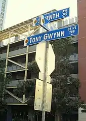 In 2007, a 9½-foot (2.9 m), 1,200-pound (540 kg) bronze statue of Gwynn was unveiled in the park just beyond Petco Park's outfield in an area named Tony Gwynn Plaza.[209][210][211] The address of Petco Park is 19 Tony Gwynn Drive.[209]
