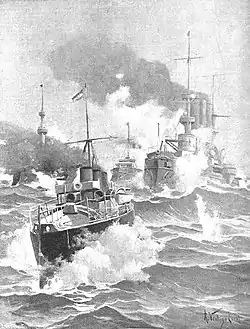 Due to her position at the extreme eastern end of the blockade, the Indiana could not participate in the initial chase after the enemy cruisers made their sortie without cutting across the bow of the USS Oregon, which Captain Taylor, the ship's commander, wisely decided not to do. The battleship and the Marines manning her secondary batteries were, however, able to engage and aid in the destruction of the Furor and the Pluton, the fifth and sixth ships bringing up the rear of Spanish line, as they left the bay. Still too close to his squadron to risk using his big guns, Taylor called on Waller and his Marines to take the destroyers under fire with the six-inch batteries. Captain Waller ran from gun to gun, shouting orders and encouragement, as his Leathernecks pulverized the Spanish ships.
