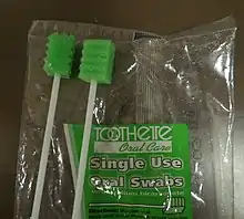 Oral care swabs are disposable, single-use oral care sponges attached to a stick. They are used for oral care in the hospital and long-term care setting.[1] Disposable oral care swabs may also be known by other various names, such as sponge swab,[2] swabs for oral care,[2] foam swab,[3] mouth swab,[4] oral swabstick, and the trademark name Toothette.