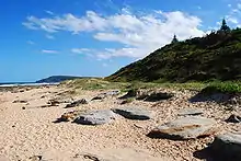 The beach is popular for swimming and fishing, with a gentle surf as the beach is protected from winds and strong currents. Sail boarding and kite surfing are popular out on the bay.