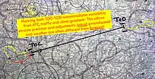 Alternatively, when manual planning and monitoring a VFR flight, TOC is an elegant and efficient way for a pilot to eliminate all the vaguery and variability of departing any airport (the turns assigned, changes of runway the pilot cannot control). TOC establishes a "starting gate" for the en route portion of a flight to allow timing and tracking along the course. A clearly determined TOC is predicated in planning along the intended route of flight far enough from the departure so that the aircraft is at altitude, on course, trimmed up in cruise flight. The variability of departure is now over and accurate tracking and monitoring of progress are beginning.