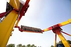 The Top Spin is a thrill ride developed by HUSS Park Attractions and Mondial, and is the generic name for a series of rides from other manufacturers that follow the same principle. The ride consists of a passenger platform suspended between two counterweighted arms. The arms are turned by motors, while the platform typically only has brakes that are engaged and disengaged at various points of the ride cycle. A typical top spin program runs the main arm motors while engaging and disengaging the platform brakes so that it will rotate in exciting ways. The minimum rider height requirement is 54 inches; maximum is 80 inches due to the seat and restraint design. The ride was introduced to the public in 1990 and proved an instant success with European fairgoers.