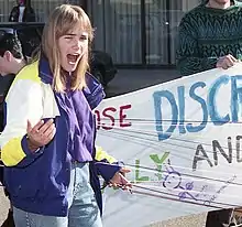 The Canadian Topfree Equal Rights Association (TERA) assists women in both Canada and the United States who are prosecuted for being topless in situations whereas men are not.[29] It does not advocate toplessness, but promotes the concept of freedom of choice of the individual woman, and the de-sexualisation of breasts.[30]