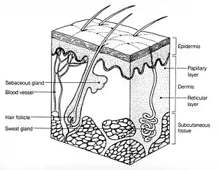 The human body's largest organ is the skin layers, which protects against foreign particles.[7][8] Human skin contains several layers, including the subcutaneous layer, the dermis, the epidermis, the stratum corneum, and the appendages. Each of these layers have an effect on the absorption of topical drug.[1] When the topical drug is applied to the skin, it must pass via the stratum corneum, which is the outermost skin layer.[8] Stratum corneum's function includes prevention of water loss in skin and inhibit the penetration of foreign molecules into the dermal layers.[8] Hence, it also prevents the hydrophilic molecules to get absorbed into the skin since it is made out of bilayered lipids.[9] With this barrier, stratum corneum affects the permeability of topical drugs. Another part of the skin is called the appendages, and it is known as the “shortcut” for topical drug delivery. The shortcut pathway allows the drug molecules to first pass the stratum corneum barrier via hair follicles.[5]