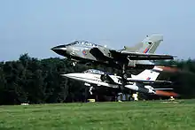 In development, significant attention was given to the Tornado's short-field take-off and landing (STOL) performance. Germany, in particular, encouraged this design aspect.[63] For shorter take-off and landing distances, the Tornado can sweep its wings forwards to the 25-degree position, and deploy its full-span flaps and leading edge slats to allow the aircraft to fly at lower speeds.[64] These features, in combination with the thrust reverser-equipped engines, give the Tornado excellent low-speed handling and landing characteristics.[65]