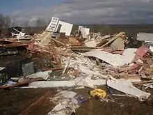 The source of this myth is from the appearance of some destroyed structures after violent tornadoes. When one wall receives the extreme pressure of tornado winds, it will likely collapse inward. This then leads to a considerable outward pressure on the three remaining walls, which fall outwards as the roof falls down, creating the impression of a house which has exploded. Damage surveys of "exploded" houses usually show at least one wall which has blown inward.[9] Additionally, if the roof is lifted before any walls fall, the walls can fall in any direction. If they fall outward, this structure can also appear to have exploded.[10]