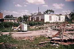 May 14 saw a brief, but strong F2 tornado injure three just east of Wooster, Ohio on the western side of Honeytown. The next day proved to be the worst day of the outbreak sequence as 12 tornadoes pummeled Texas and Oklahoma with nine of them occurring in the Texas Panhandle, most of which were significant (F2+). An F3 tornado injured one in rural Donley County. Another F3 tornado then slammed Vigo Park. Later, a surprisingly fatal F0 tornado killed one while moving in an odd northwestward trajectory in rural Floyd County. The most catastrophic tornado then struck: a violent F4 tornado touched down right over Silverton, obliterating it and areas northeast of town in rural Briscoe County, killing 21 and injuring 80.[1]