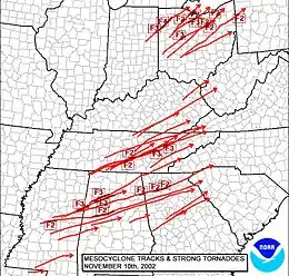 ![]() Paths of the tornadoes generated during the Veterans Day outbreak. | |