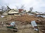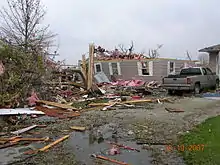 Tornado activity the following day was much more significant, especially in Arkansas. An EF3 passed near the town of Strong, Arkansas, heavily damaging homes and mobile homes. A brick house was mostly destroyed, and a double-wide mobile home was completely destroyed, with debris scattered up to 200 yards away. 5 people were injured.[20] An EF2 tornado struck the Mt. Olive community in Bradley County a short time later. A house suffered major damage and a mobile home was destroyed there. An elderly woman was injured in the house, and a family of five was injured in the mobile home. Three other homes had minor damage, and several sheds and outbuildings were destroyed. Thousands of trees were blown down, as were a number of power poles and power lines.[21] A second EF3 tornado formed and tore directly through the town of Dumas, where 25 businesses were destroyed, along with 19 homes. More than 65 additional homes sustained minor to moderate damage. Six mobile homes were destroyed, along with an athletic park. A community building sustained major damage, as well as a 20-unit assisted living center. An electrical substation was destroyed, leaving the area without power for several days. Numerous trees and power lines were also blown down. Farther to the northeast, in the community of Back Gate, 11 mobile homes were destroyed and 12 sustained minor damage. One house was destroyed, along with three that were damaged. This tornado injured a total of 28 people along its path.[22] After the Dumas tornado dissipated, an EF2 tornado touched down and passed north of Monticello before dissipating near Garrett Bridge. That tornado snapped hundreds of trees, damaged or destroyed several shop buildings and a barn, partially destroyed one house and damaged another.[22][23] Further south, two EF2 tornadoes touched down in Louisiana. Overall, the outbreak resulted in 20 tornadoes and no fatalities.[19] Damages from the tornadoes totaled to US$48.41 million.