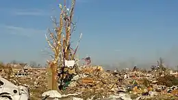 On May 19, the slow-moving system produced another severe weather event just east of the previous day. Multiple tornadoes, mostly brief, were reported in Kansas once again.[93] An EF2 tornado touched down near southwest Wichita, damaging several homes and many trees.[94] Further south, two long-tracked wedge tornadoes moved in two corridors from Luther to Tryon and from Norman to McLoud in Oklahoma. Damage in both swaths was severe to extreme, with many houses destroyed. The second of these intense tornadoes, an EF4, struck a mobile home park near Shawnee in Pottawatomie County, damaging or destroying 30–35 homes. Two people were killed and six others were injured there. Storm spotters reported scoured earth along the tornado's track in this area. Throughout the state, 20 people were treated for injuries, while many others likely sustained minor injuries.[95]