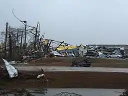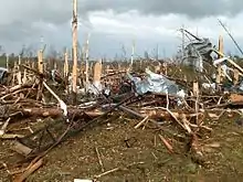 A devastating outbreak of tornadoes ripped across parts of Mississippi, Alabama, Tennessee, Iowa, Nebraska, Missouri, Kansas, Oklahoma, Arkansas and Florida in late April 2014. The event began on April 27, as multiple intense tornadoes touched down across parts of the Midwest, Ozarks, and Great Plains. A strong EF2 tornado struck Quapaw, Oklahoma and Baxter Springs, Kansas, resulting in one fatality, 37 injuries, and severe damage in both towns. An EF1 tornado destroyed multiple outbuildings, killing two people as it passed near Martinsburg, Iowa. A large, violent wedge tornado struck Mayflower and Vilonia, Arkansas later that evening, causing catastrophic damage and killing 16 people as numerous homes and businesses were obliterated, some of which were swept completely away. Trees were completely denuded and debarked, vehicles were thrown and mangled beyond recognition by the tornado, which was rated a high-end EF4, the first violent tornado of the year.[28][29] Destructive tornadoes continued to touch down on April 28, and 10 people were killed when an EF4 tornado struck Louisville, Mississippi, where many homes, apartment buildings, and businesses were completely destroyed, some of which were leveled or swept away. An EF3 tornado caused one fatality and major damage to many structures in Tupelo, Mississippi as well, and another EF3 struck Coxey, Alabama, destroying a mobile home park and killing two people. Numerous other strong tornadoes occurred in rural areas of the Deep South later that night and into the early morning hours of April 29. Additional weak tornadoes touched down in The Carolinas and Florida on April 29 and 30 before the outbreak came to an end. 82 tornadoes were confirmed as a result of this outbreak, which resulted in 35 fatalities.[30]