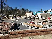On January 19, the Storm Prediction Center issued a slight risk of severe weather for much of Mississippi and Alabama, along with parts of Louisiana, Georgia, and the Florida Panhandle. This included a 5% risk of tornadoes. A small tornado outbreak impacted the Deep South later that day. Five weak tornadoes struck Mississippi and Louisiana in the morning hours, including an EF1 tornado that destroyed a mobile home and a storage building and caused considerable roof damage to surrounding homes to the northeast of Franklinton, Louisiana.[9] A high-end EF2 tornado caused significant structural damage in Wetumpka, Alabama. The First Presbyterian Church was destroyed, along with the First Baptist Church, the police station, a senior center, and several homes were severely damaged or destroyed. Four people were injured.[10][11][12] An EF1 tornado near Booth, Alabama destroyed a trailer, injuring two people inside.[10] Three other EF1 tornadoes touched down in Alabama and the Florida Panhandle, including one that caused damage at Tyndall Air Force Base. Overall, this outbreak produced 10 tornadoes and resulted in six injuries.[10][13]