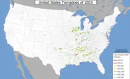 ![]() A map of 2023 United States tornado paths from the results of preliminary surveys. | |