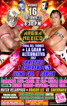 Starting in 1994 the Mexican professional wrestling promotion Consejo Mundial de Lucha Libre (CMLL) created a special tournament concept where they would team up a novato, or rookie, with a veteran for a single-elimination tag team tournament.[1][2] The tournament was called El Torneo Gran Alternativa, or "The Great Alternative Tournament" and became a recurring event on the CMLL calendar. CMLL did not hold a Gran Alternativa tournament in 1997 and 2000 held on each year from 2001 through 2014, opting not to hold a tournament in 2015. The 2016 Gran Alternativa tournament will be the 21st overall Gran Alternativa tournament. All tournaments have been held in Arena México, CMLL's main venue and up until 2016 all tournaments had taken place on Friday nights, with the 2016 tournament being the first time the Gran Alternativa was held as part of CMLL's Tuesday night shows.[3] I 2017 the tournament returned to Friday nights, being held on the June 2, June 9 and June 16, 2017 Super Viernes shows,
